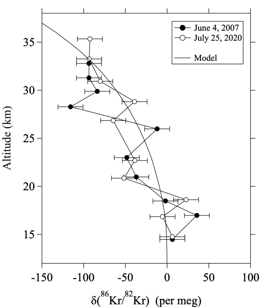 日本上空成層圏において観測されたクリプトン同位体比の鉛直分布と数値モデルによるその再現(Sugawara et al., 2026, Fig.2より抜粋)