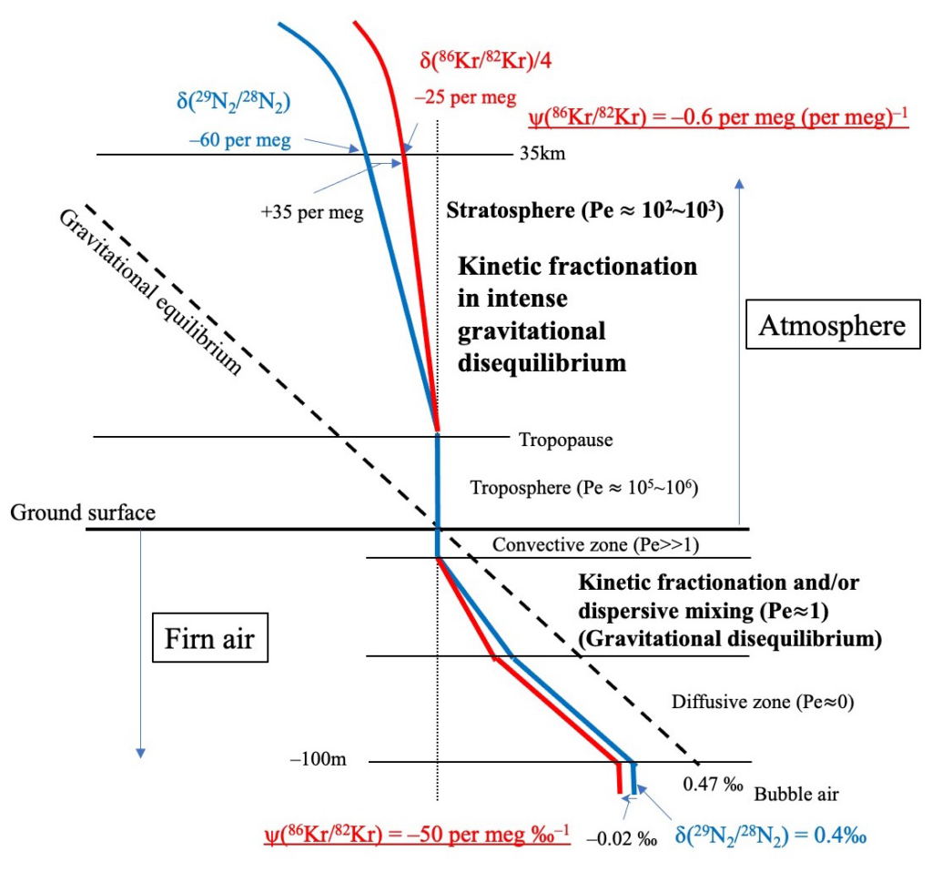 成層圏大気とフィルン空気の中で起こる重力分離と動力学的分別を模式的に表した図。成層圏とフィルンでは縦軸と横軸が異なる。(Sugawara et al., 2026から抜粋)